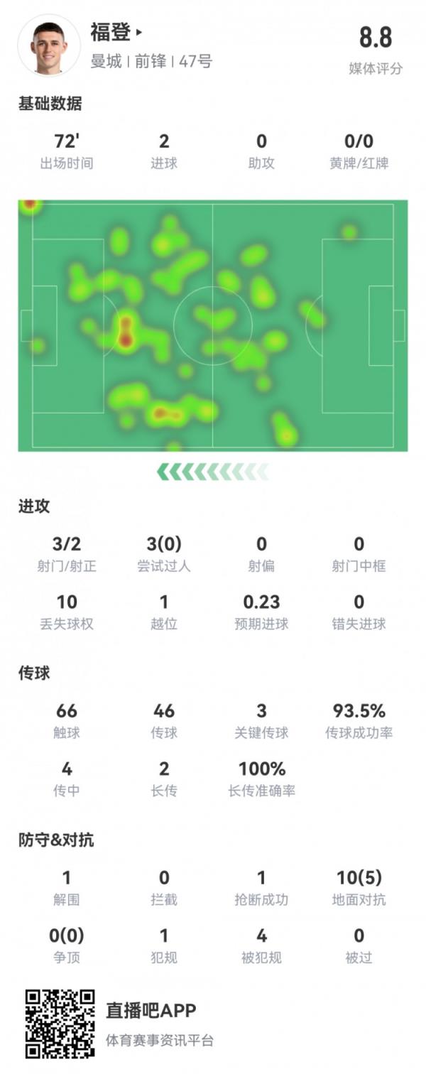福登本场数据:2粒进球,预期进球0.23,3次关键传球,评分8.8